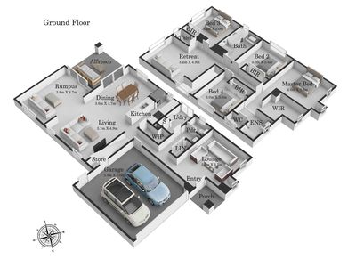 Downstairs features an open-plan kitchen with modern appliances and a dishwasher, seamlessly flowing into the living and rumpus areas, with large sliding doors opening to a covered alfresco, perfect for year-round entertaining. An additional lounge at the entrance, separate laundry, and powder room complete the practical layout.